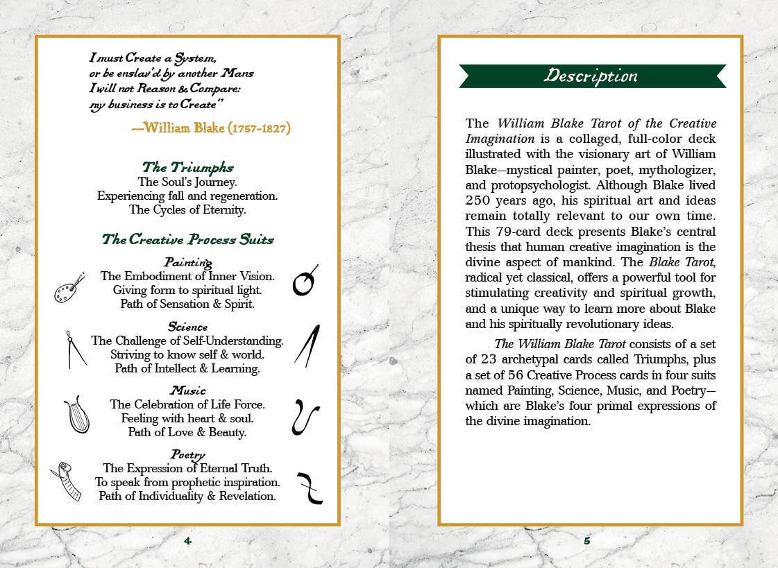 The William Blake Tarot of the Creative Imagination is a practical and inspirational tool for personal creativity that features the art and ideas of William Blake (1757–1827). Based on his central thesis that human creative imagination represents the divine aspect of man, this Tarot card deck represents something really new for William Blake—a way to take him home and get acquainted with him as never before possible. Unlike textbooks and critical studies, this deck presents his ideas and images in a manner that is easy to absorb, and much more fun. It contains 23 archetypal cards called Triumphs, plus a set of 56 Creative Process Tarot cards in four suits named Painting, Science, Music, and Poetry—which are Blake’s four primal expressions of Divine Imagination. Use this portable idea-kit to creatively explore personal and professional issues and discover meaningful insights into life's great mysteries.